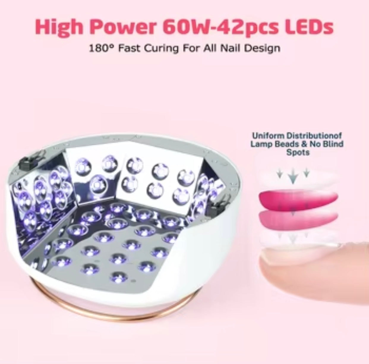 - UPGRADED DUAL LIGHT SOURCE & FAST CURING NAIL - Using advanced LED double light source bulb technology to cure all kinds of nail gels without distinguishing nail polish gels type;An industry leading 60 watts of power offers 80% faster curing speeds than lower wattage UV nail lamp;Enjoy ideal professional salon nail art easily and freely at home with our gel nail light